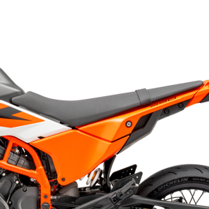 Taking inspiration from the KTM EXC range, but with added comfort for longer commutes or trips, the KTM 390 SMC R has a new 860 mm single-piece flat seat design for easy on-board mobility and getting low into an apex.