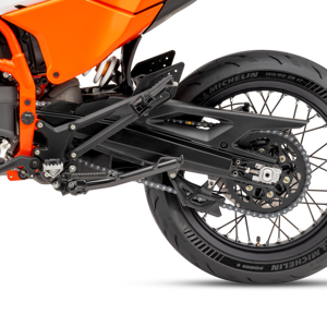 A gravity die-cast swingarm has been specifically developed for the KTM 390 SMC R, and provides a sturdy and durable platform for the rear suspension system. Featuring a direct shock absorber mount offset to the side, it creates additional space for the unique exhaust system.